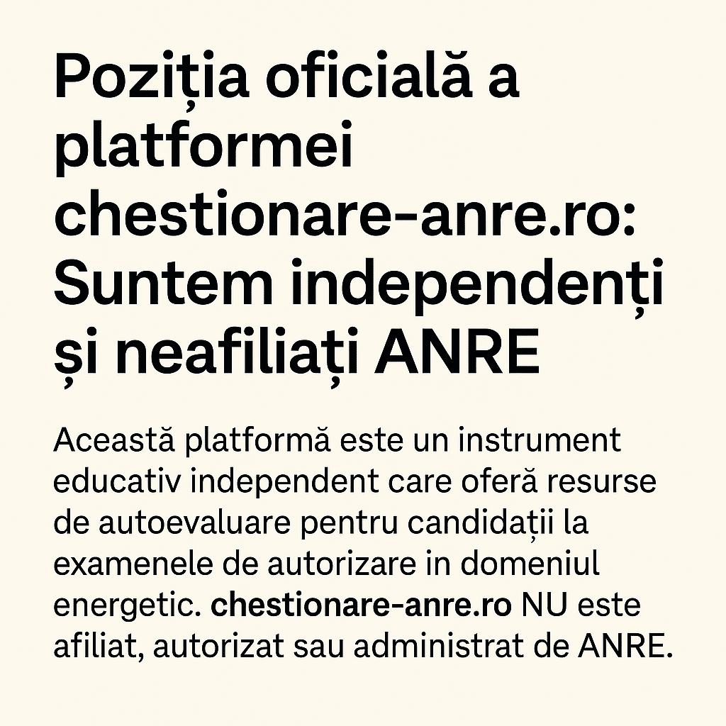 Recent, Autoritatea Națională de Reglementare în domeniul Energiei (ANRE) a emis o informare publică în care s-a delimitat de site-ul nostru, chestionare-anre.ro, și a precizat că nu are legătură cu platforma noastră. În acest context, considerăm că este responsabilitatea noastră să venim cu o poziție clară și sinceră, adresată tuturor celor care folosesc sau intenționează să folosească site-ul nostru pentru pregătirea examenelor de autorizare ANRE.